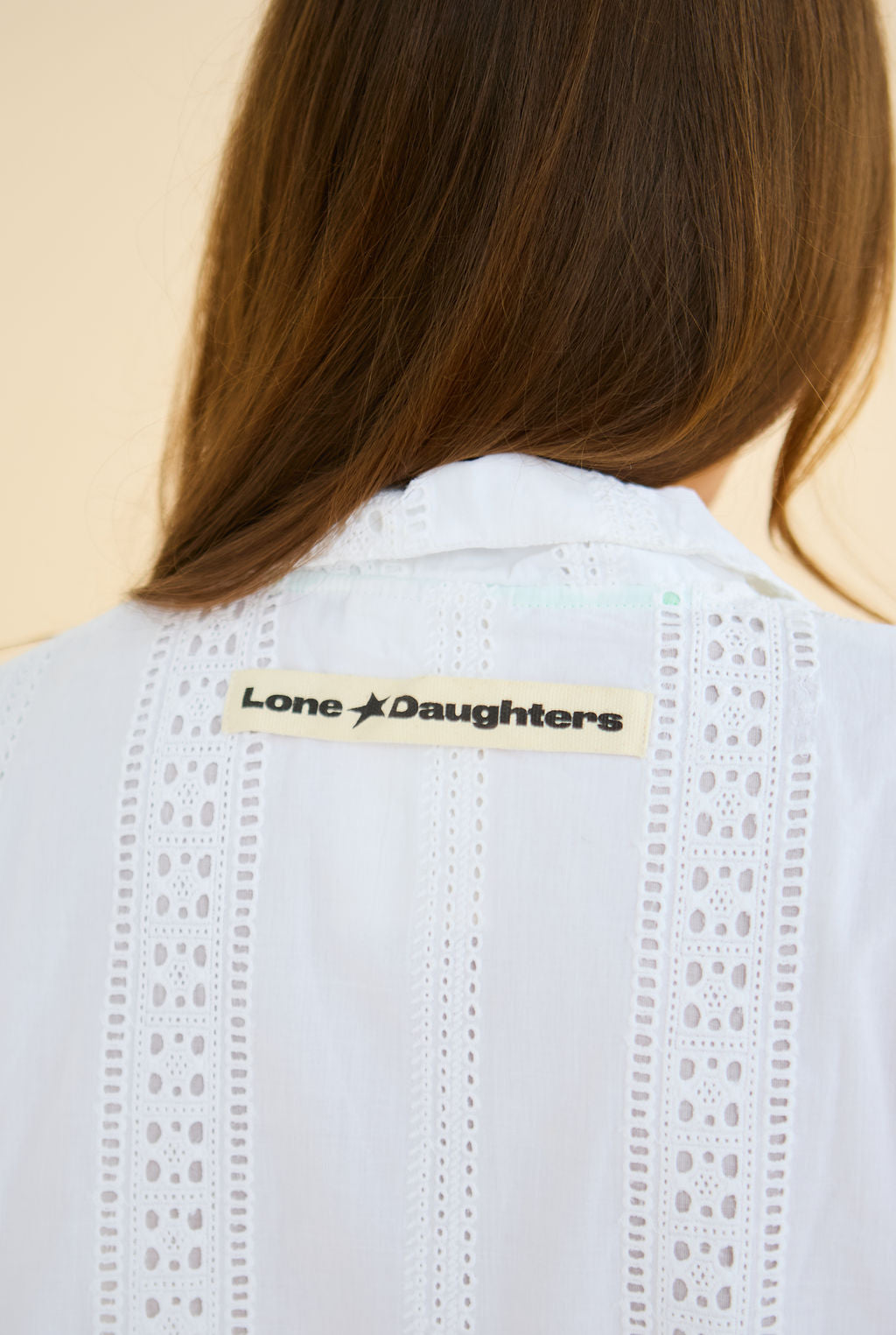 Alabama Lace is a soft cotton with vertical broidery anglaise stripe featuring tiny embroidered cut work holes.