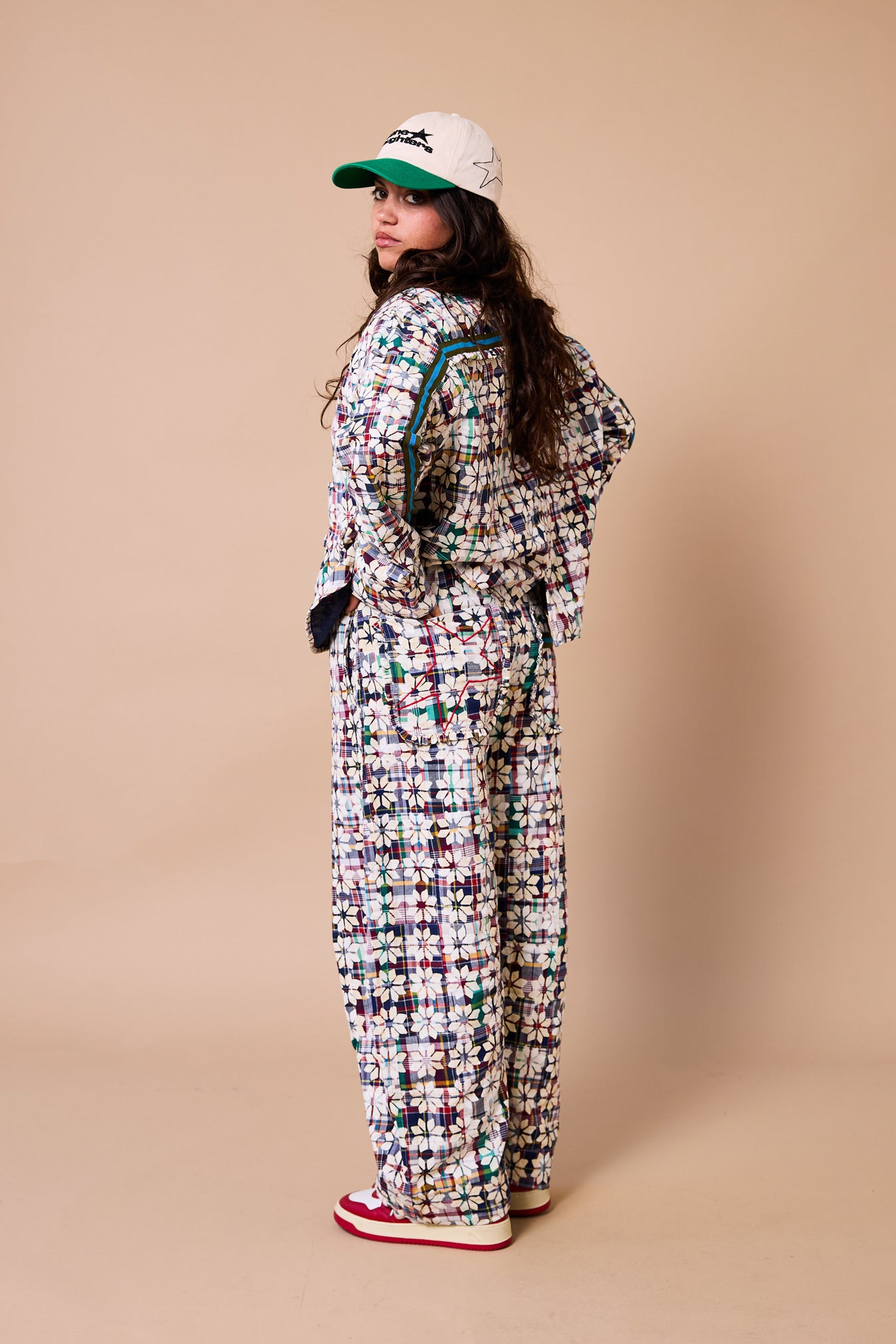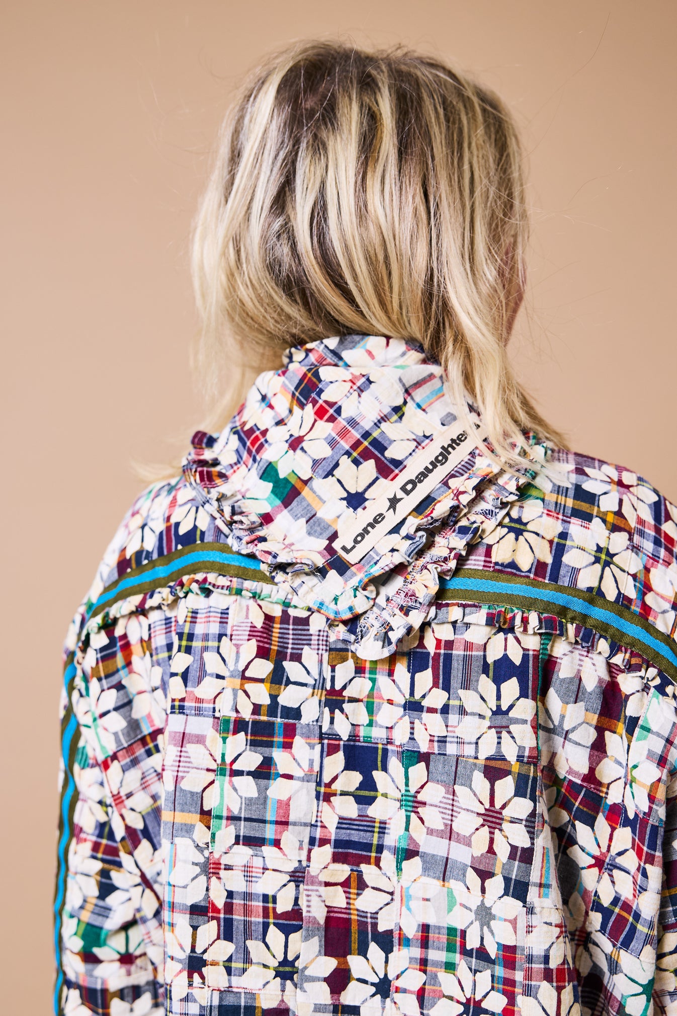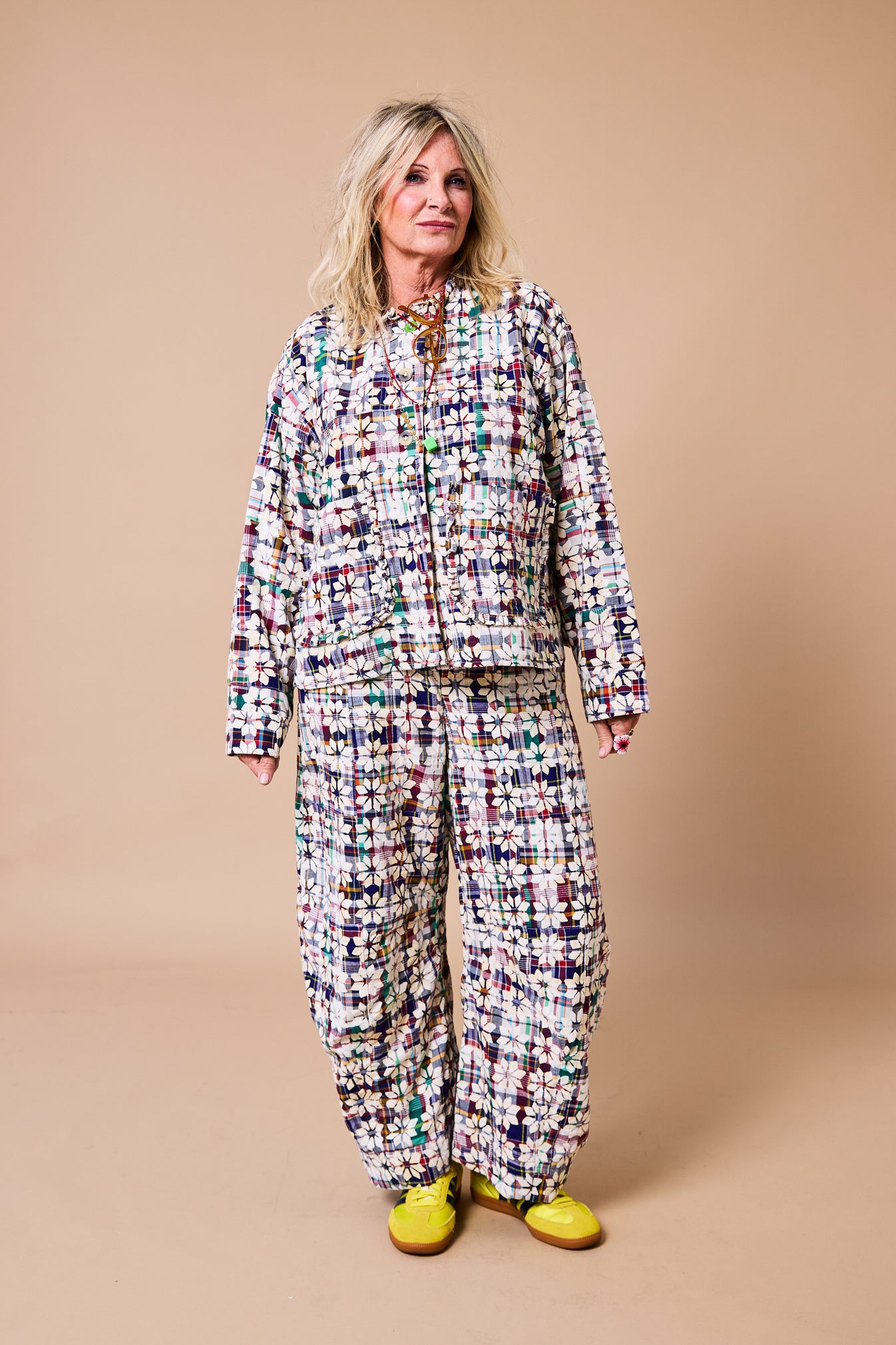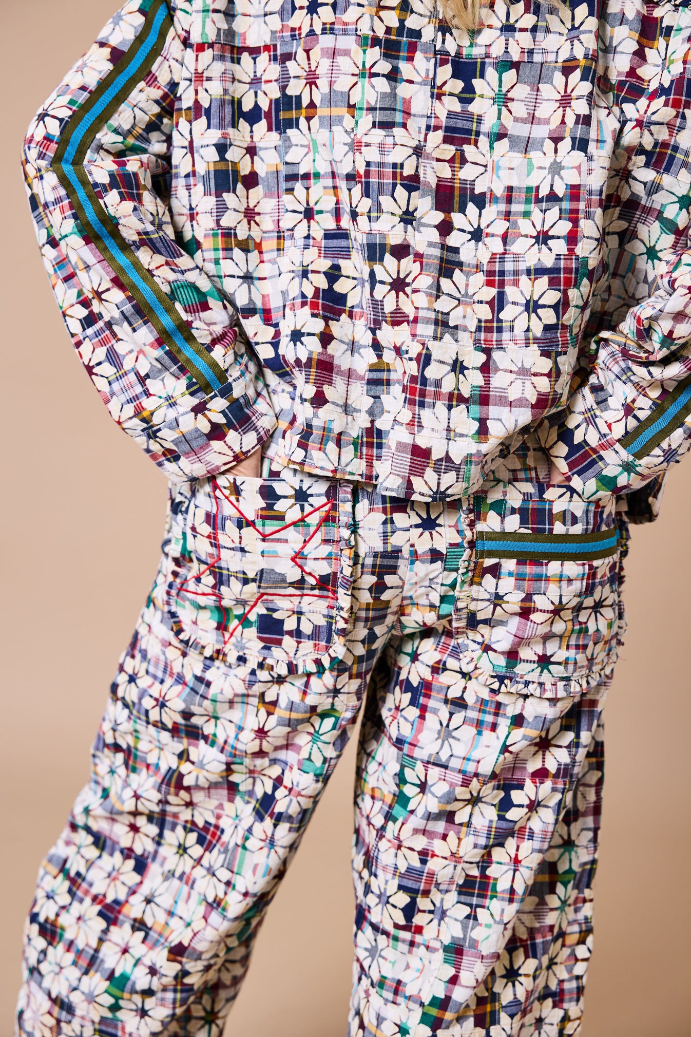 Featuring our new exciting combination of the ‘hoe-down’ pant and sized up frenchie shirt, this set is relaxed and oozing with artisan features! First we patch worked classic check shirting and then block printed it with cream graphic daisy’s, finished with a stunning trim of striped webbing tape.