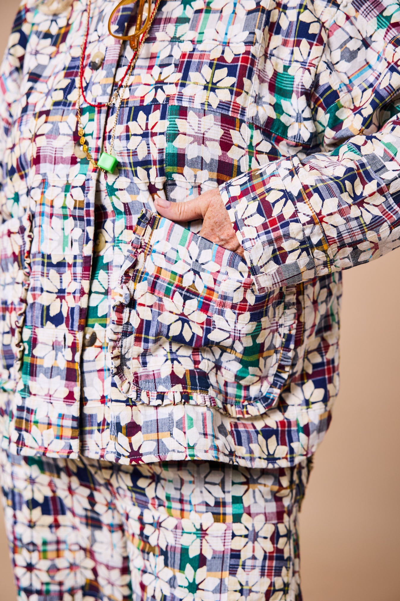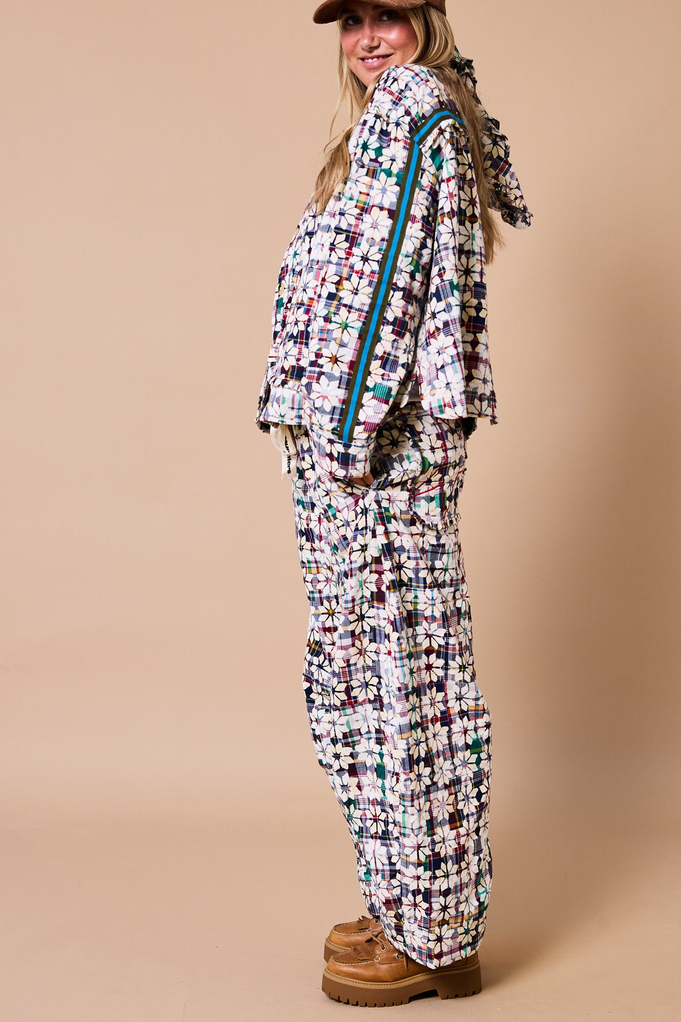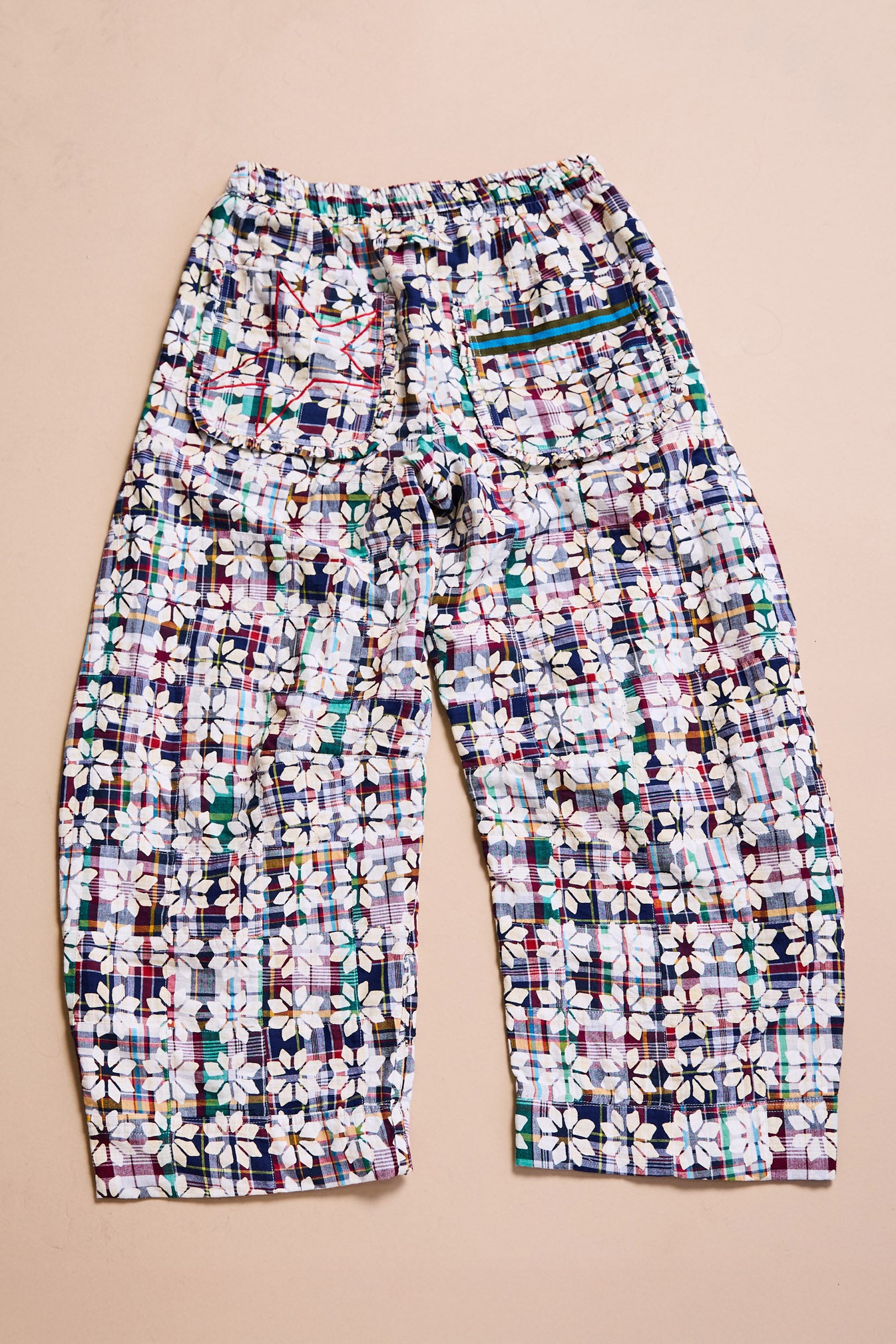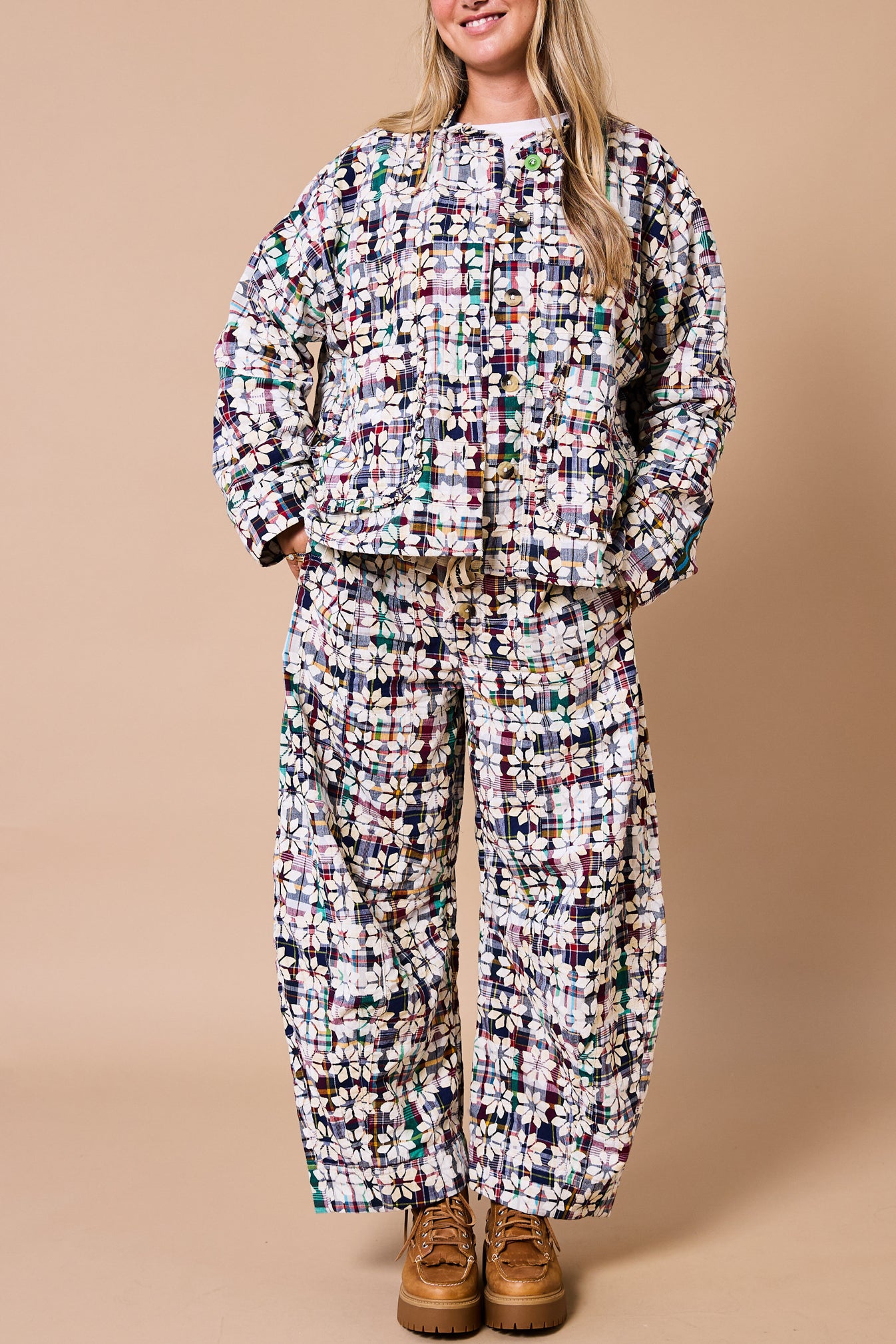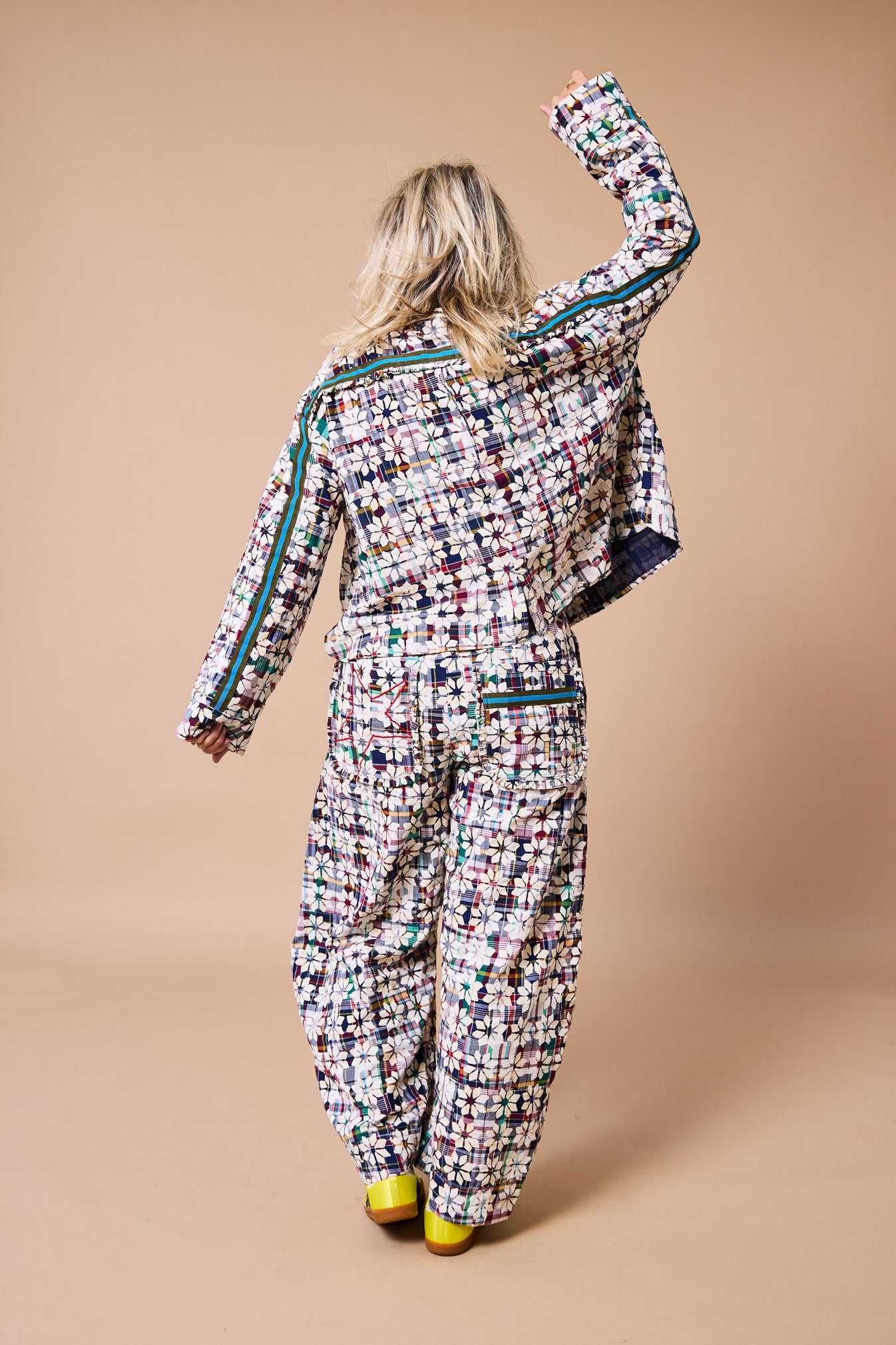 Featuring our new exciting combination of the ‘hoe-down’ pant and sized up frenchie shirt, this set is relaxed and oozing with artisan features! First we patch worked classic check shirting and then block printed it with cream graphic daisy’s, finished with a stunning trim of striped webbing tape.